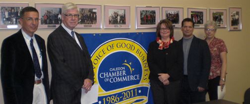 In the photo (from left to right): Dumitru Olariu (Canadian Intellectual Property Office); David Tilson, M.P. (Dufferin-Caledon); Kelly Darnley (President & CEO, Caledon Chamber of Commerce); Paul Legault (Corporations Canada); and Suzanne Doig (Communications & Member Services, Caledon Chamber of Commerce).