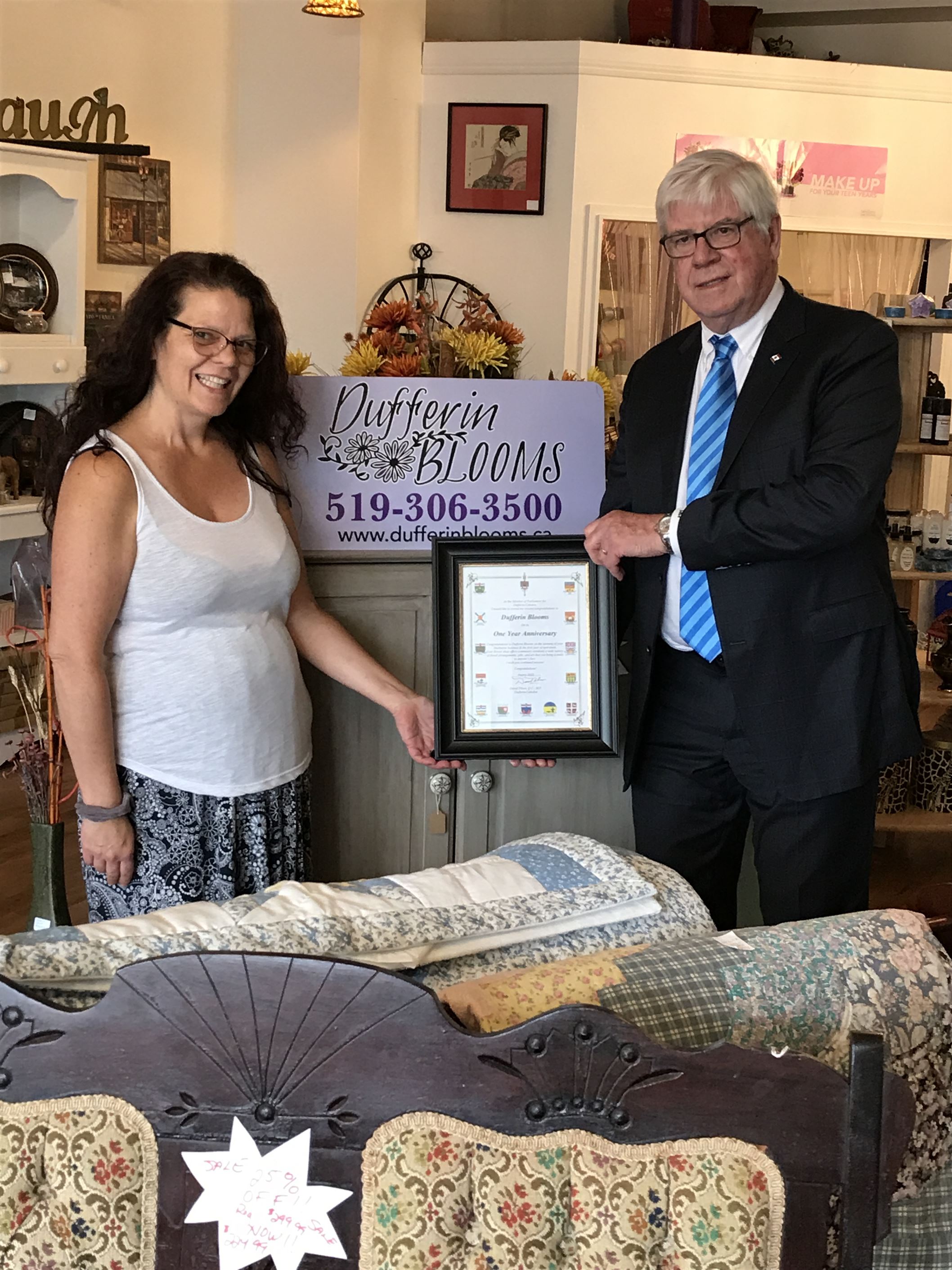 David with Nancy Sova owner of Dufferin Blooms David with Nancy Sova owner of Dufferin Blooms celebrating her first year of operation in Shelburne. September 14, 2021